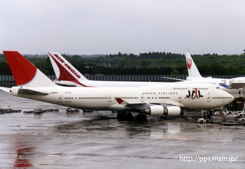↑国内線仕様のJA8907。トーイングカーがまだJAS色である。(2000/07撮影 羽田空港)
