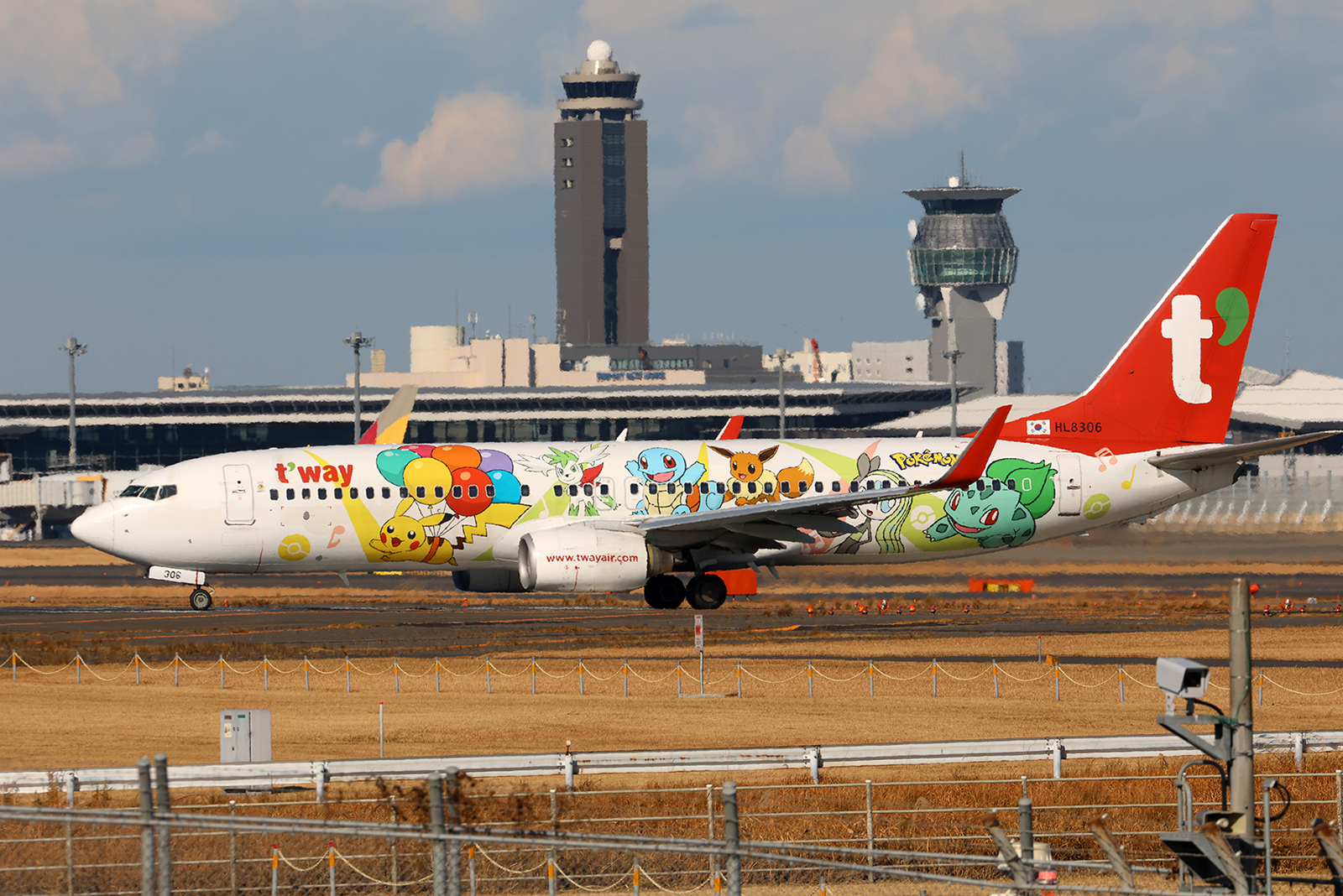 T'Way Air Boeing737-8AS(HL8306)"ピカチュウジェットTW" 製造/ライン番号:40308/3561 就航期間:2022/12〜 撮影日:2024/12/27 撮影場所:成田国際空港 「そらとぶピカチュウプロジェクト」の一環で登場した特別塗装機。左右でデザインが異なる。